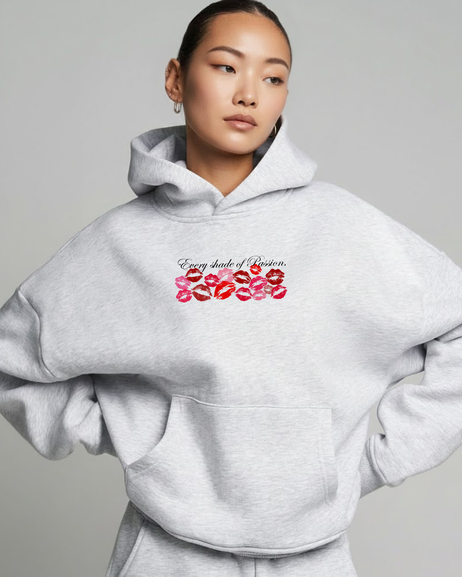 The front graphic features a playful lineup of kiss marks in every shade of red and pink, paired with the elegant script “Every Shade of Passion.