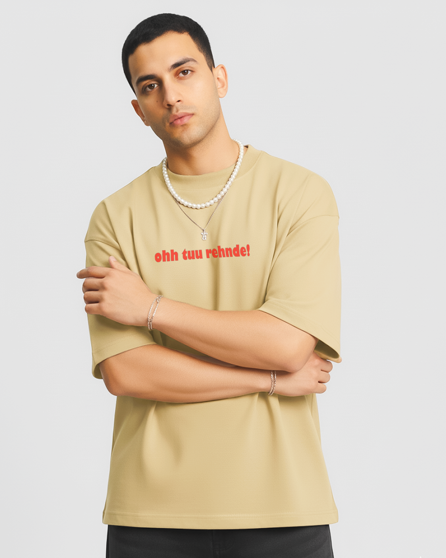 Sometimes the attitude is louder than the outfit 😎. This Klosat exclusive keeps it raw with “Ohh Tu Rehnde” splashed in striking red—a straight-up desi street statement, no translation needed. Minimal print, maximum impact.