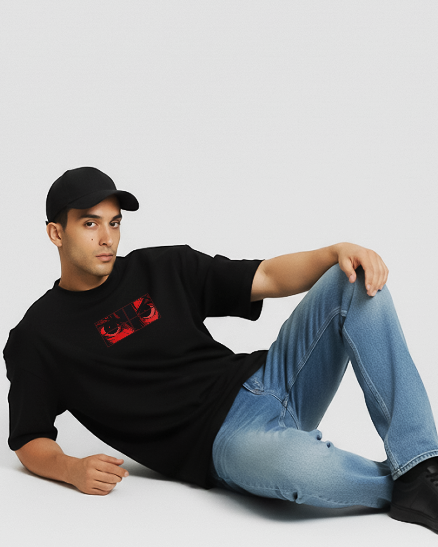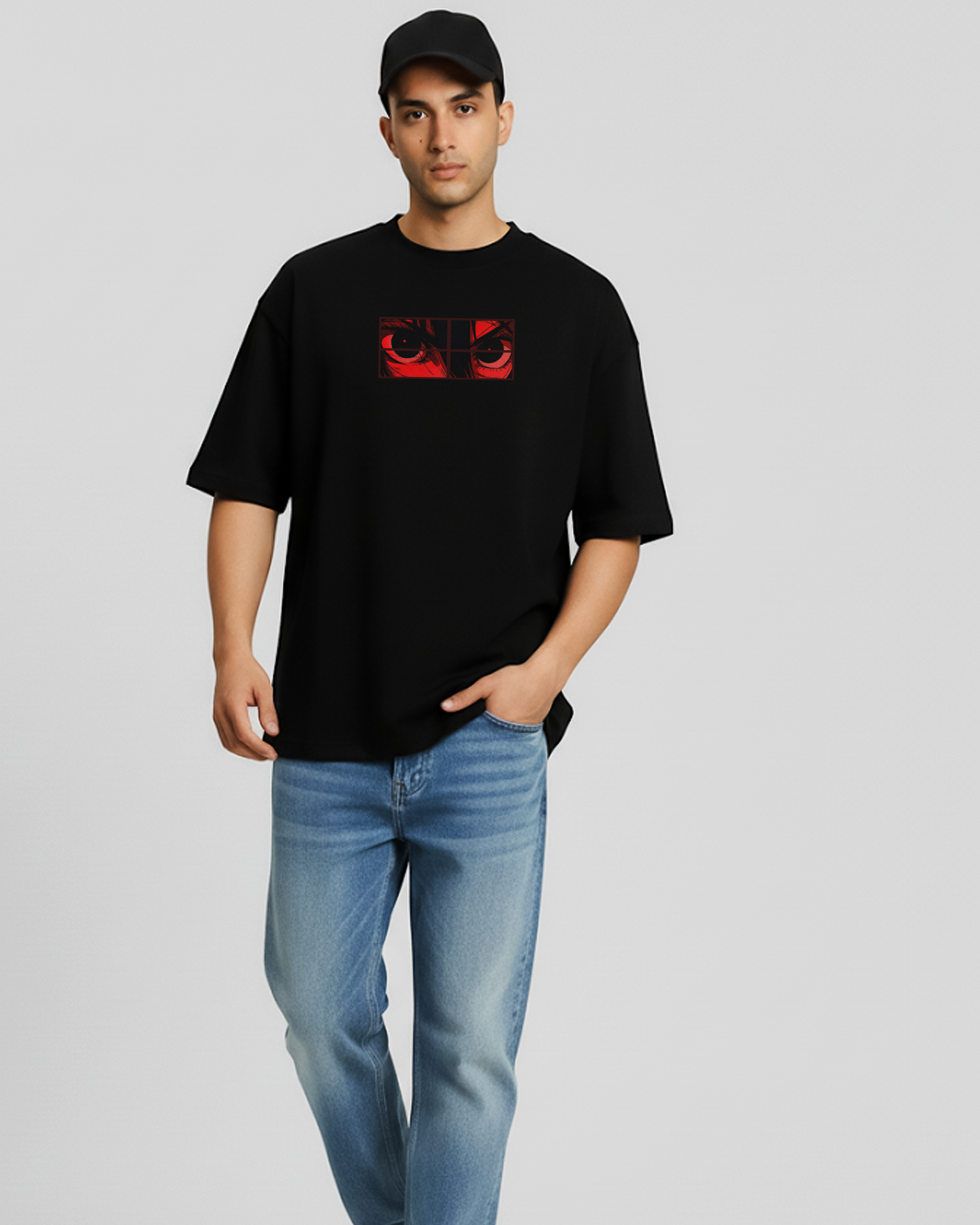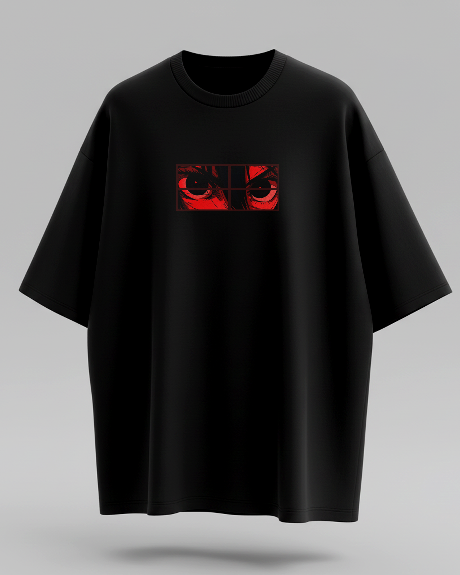 These eyes don’t just look—they see the real you. The bold red-and-black anime eye print framed in panels gives that “watching through a window” vibe, like your true personality is being caught.