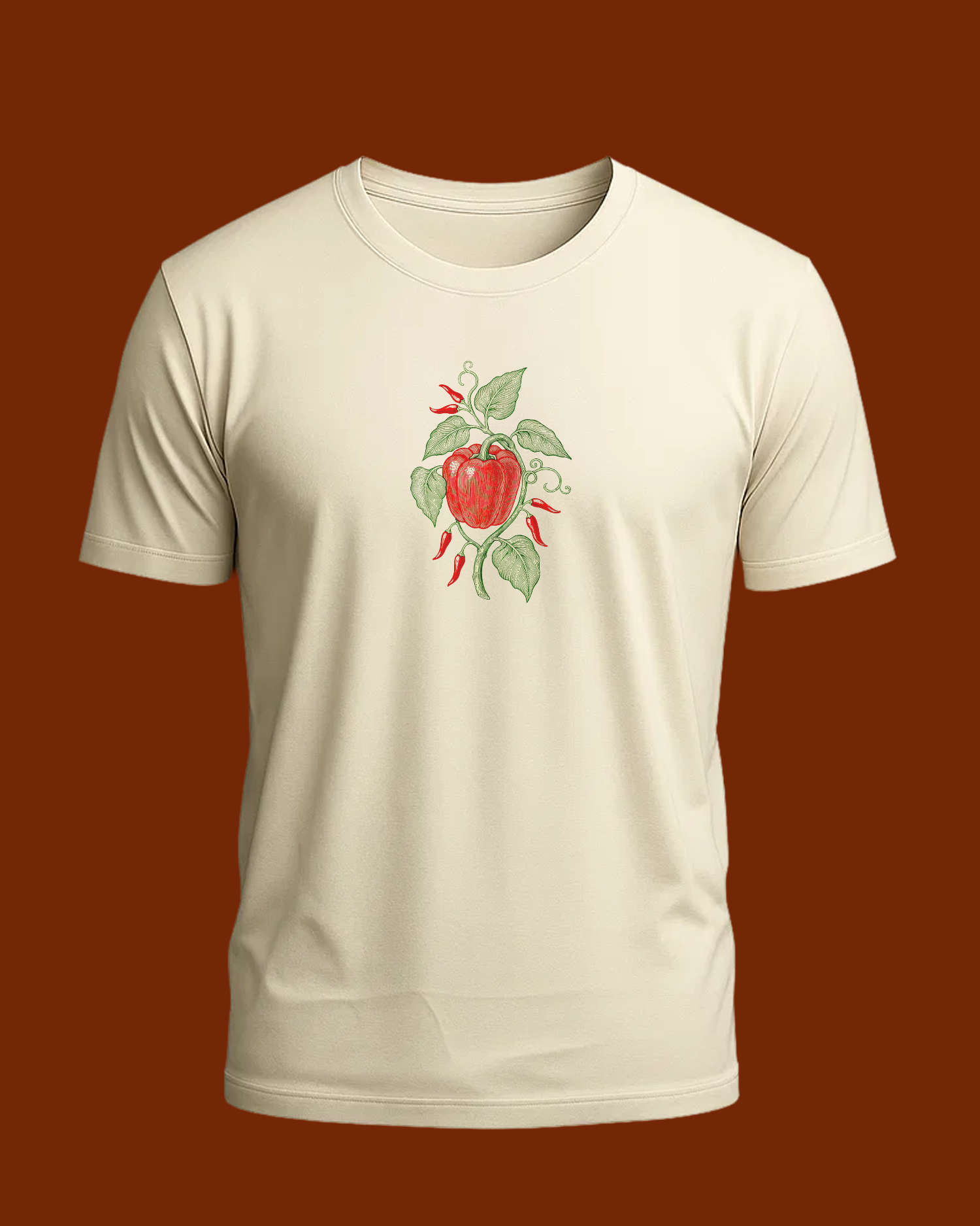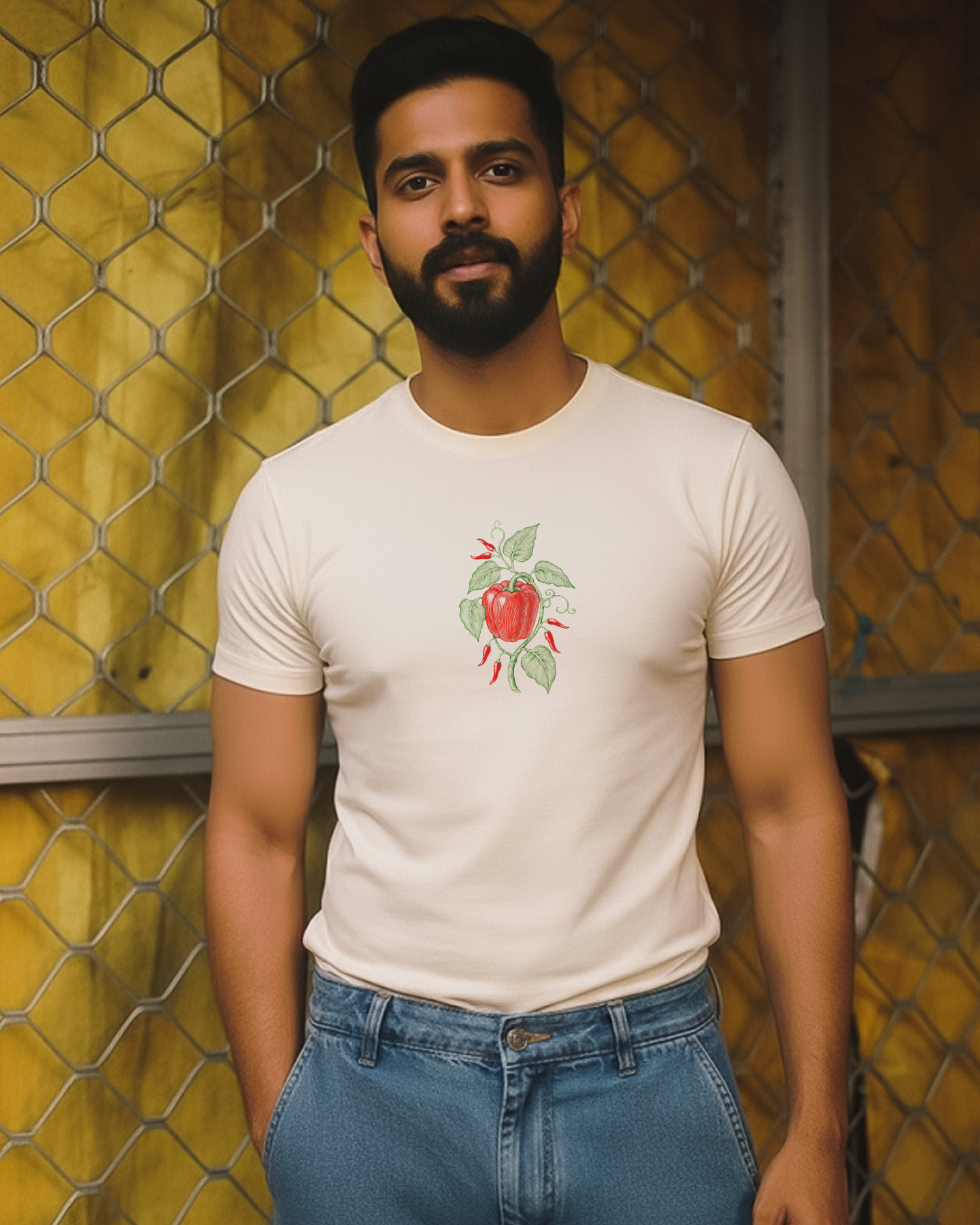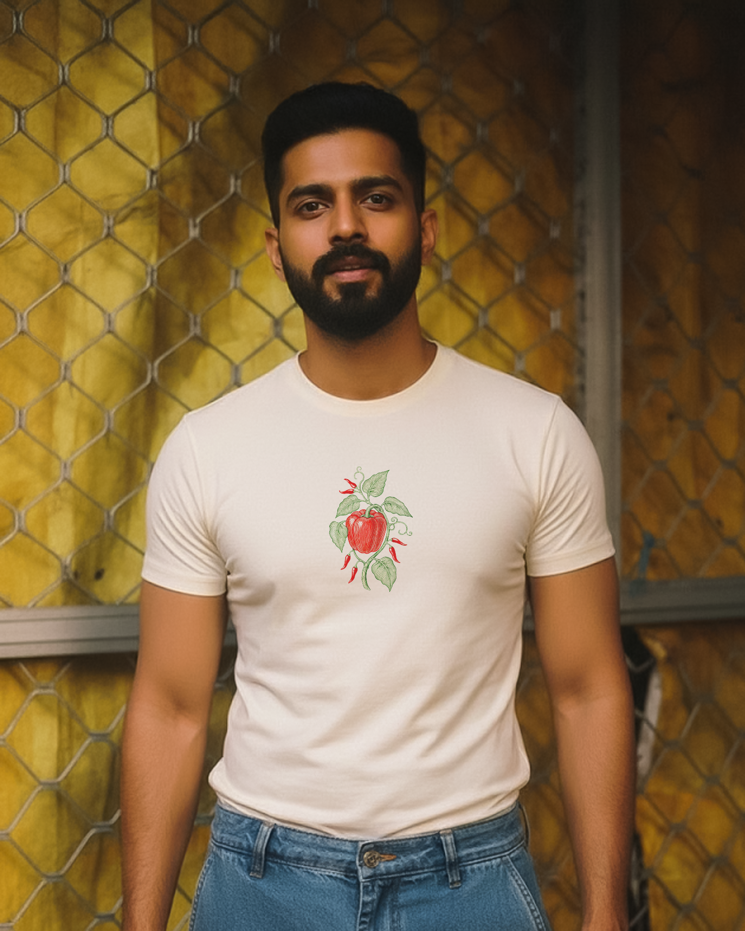 Add some heat to your fit with “Spicy Affair.” A bold hand-drawn artwork of fiery red chilies & bell pepper tangled in lush greens, this tee is all about flavor, fire & freshness. A perfect mix of foodie vibes + artsy streetwear.