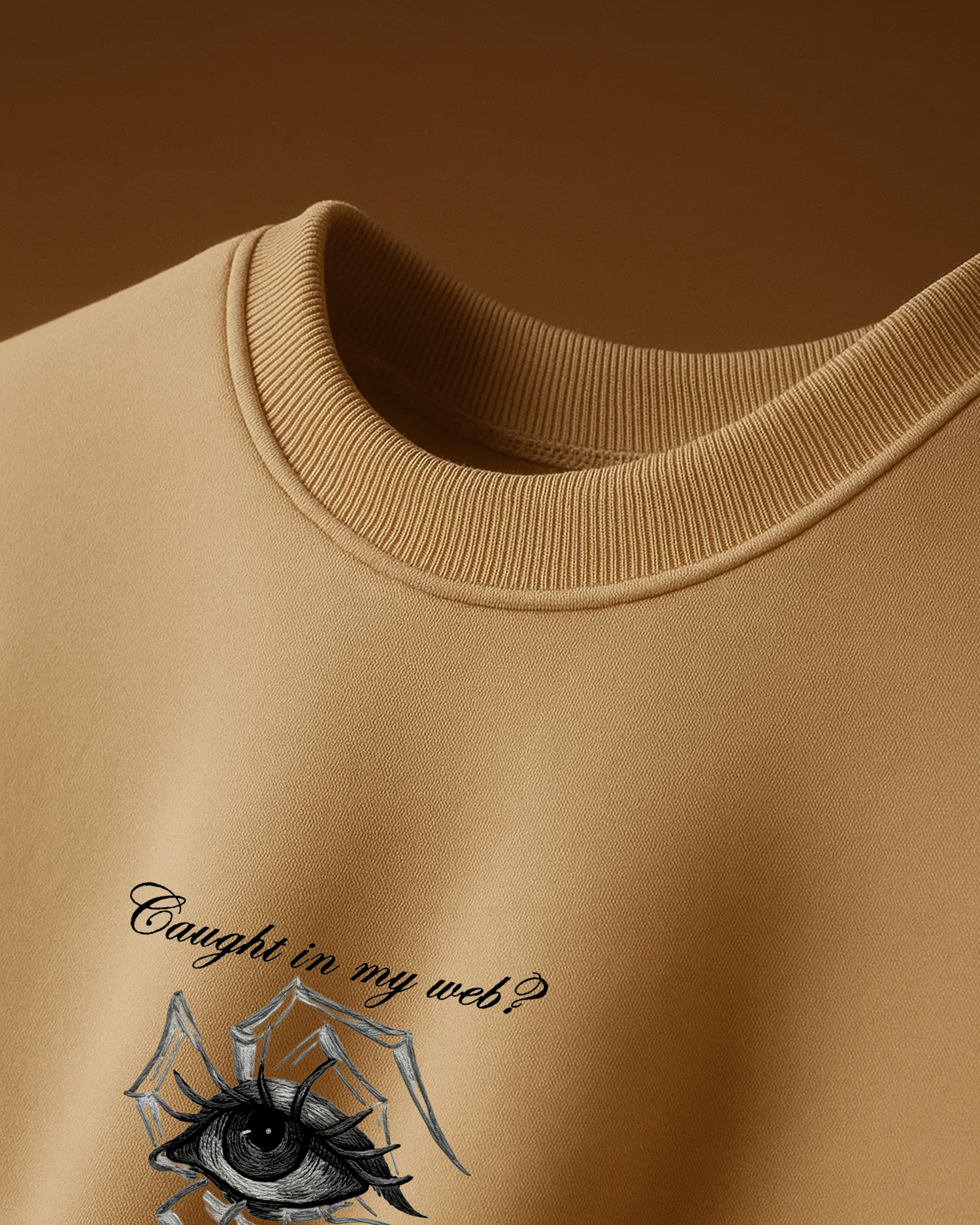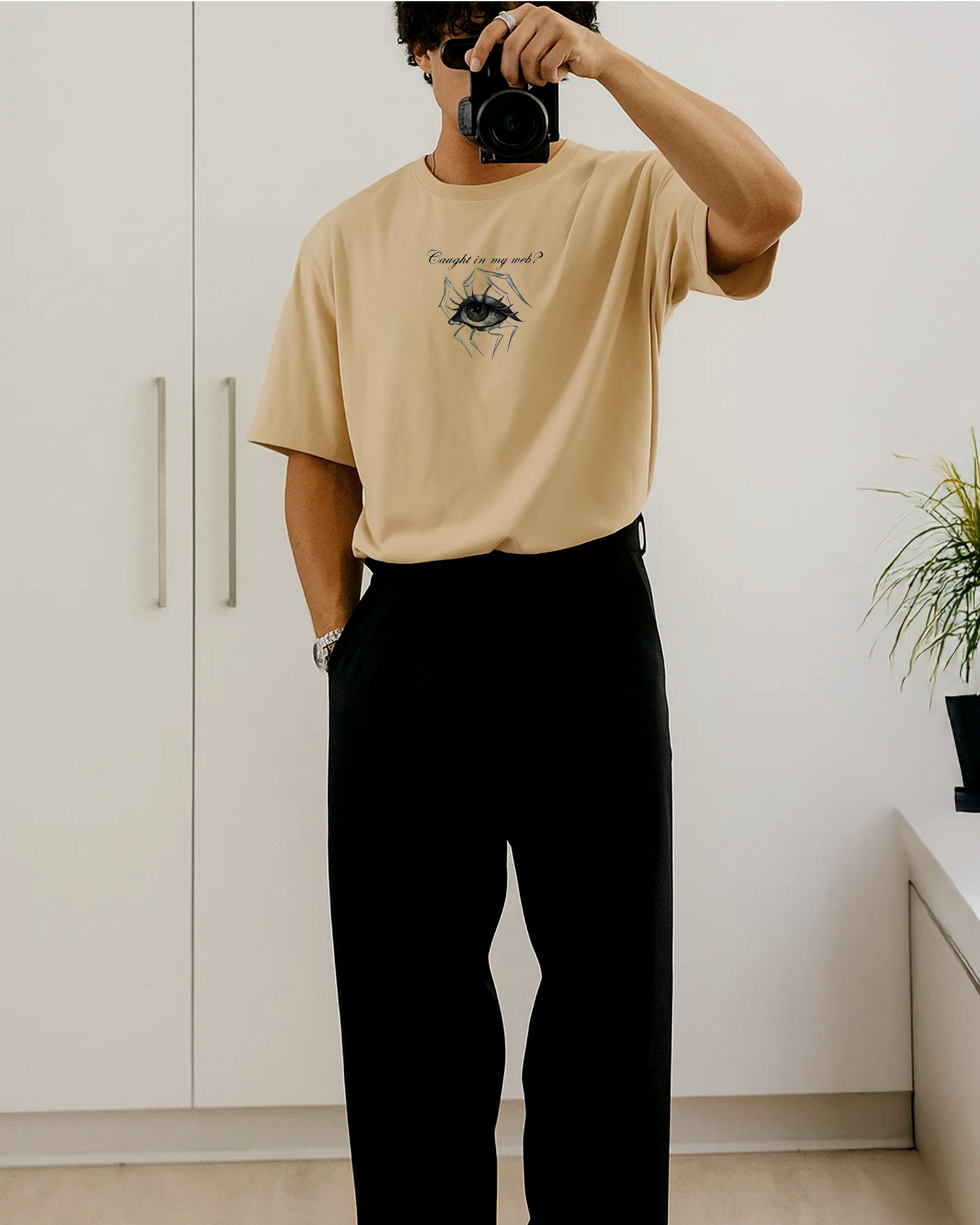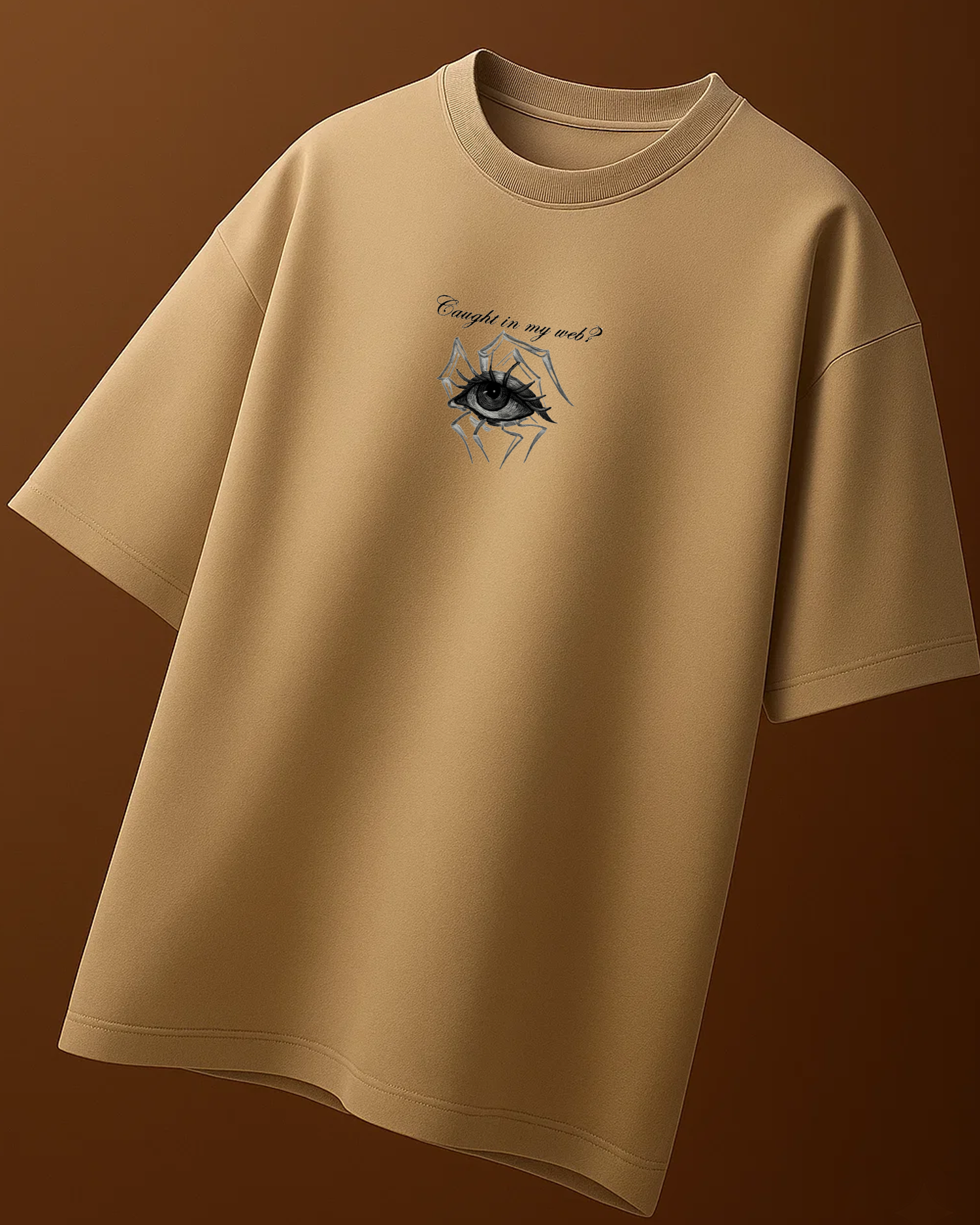 Step into the trap (the stylish one 😏). This Klosat exclusive features the bold “Caught in my web?” print with an eye-spider graphic that’s made to turn heads and catch stares.