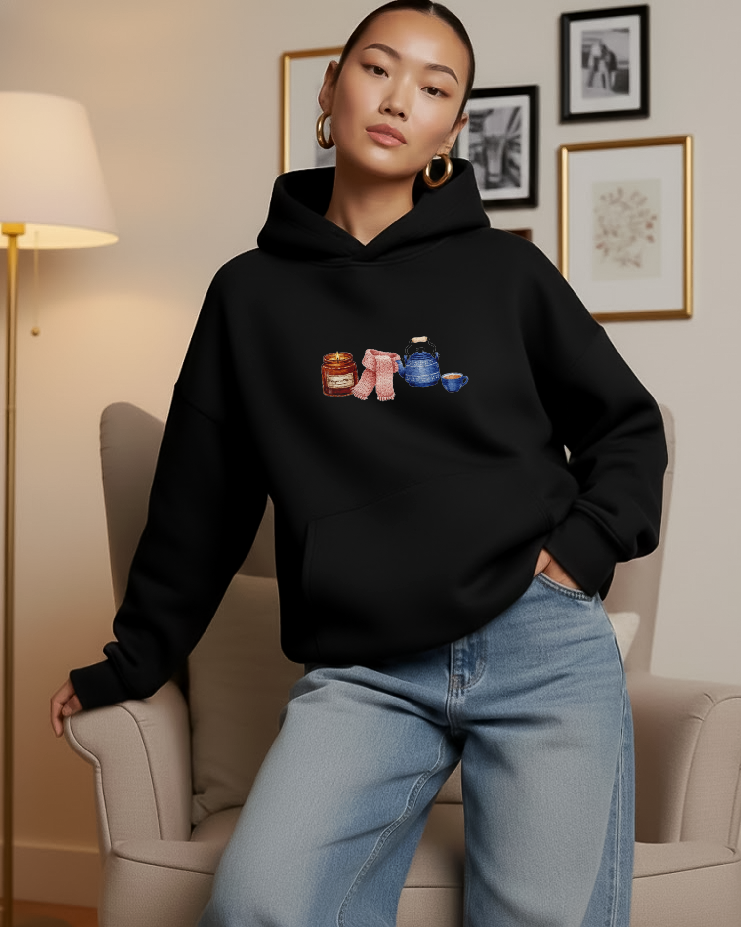 Wrap yourself in warmth with our a perfect Winter Ritual Heavy Fleece match for slow mornings and soft winter evenings. The front graphic features a glowing candle, a knitted scarf, a classic kettle, and a warm cup of tea, capturing the pure essence of comfort.